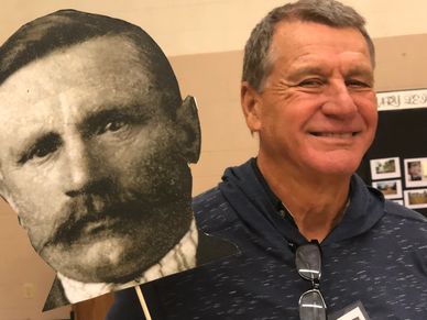 Join with Leisz family members to enjoy an all-day or half-day event (see other blocks in this section for details). Early registration, meet and greet, set up your photo boards with old family photos, share memorabilia and memories. And be sure to take a selfie with life-size cutouts of our Leisz ancestors! Here Don Fritch poses with a headshot of his maternal grandfather, Leisz Brother Leopold (1863-1925). See any resemblance?