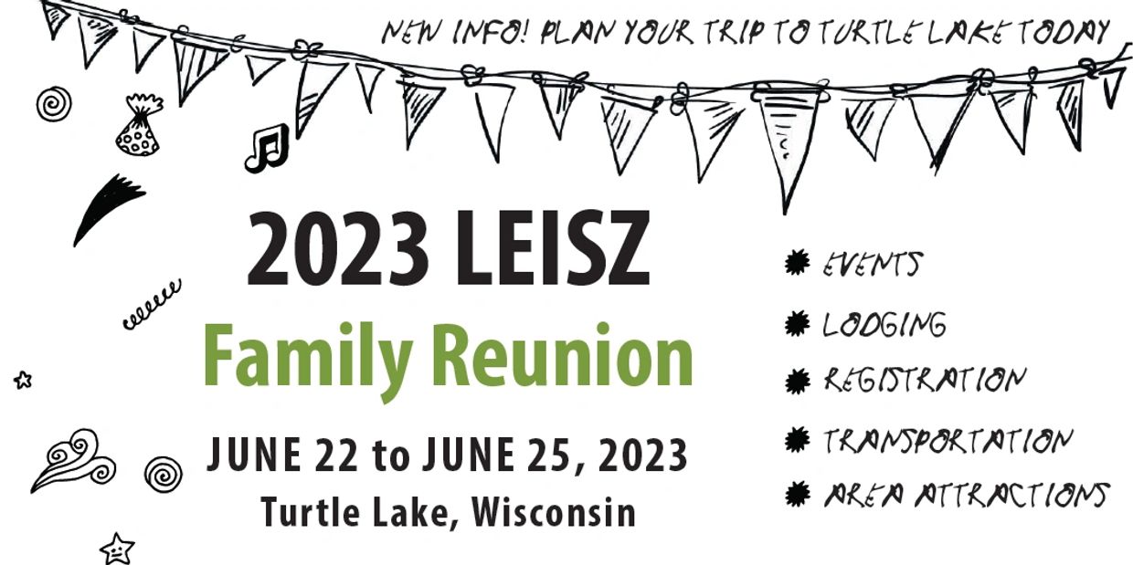 We’ve reserved a block of rooms at the all-new Northwoods Best Inn in Turtle Lake from Jun 21-26—they will go fast! Call 715-986-2070 and ask for “Leisz Family Reunion” Group Account No. 258129. Other lodging options including B&B and camping: https://www.turtlelakewi.com/ and search for “places to stay”.