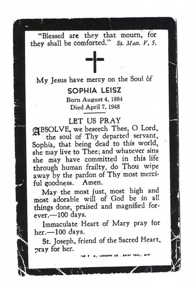 Anton and Sophia would go on to have two more children: Gladys "Gladie" Leona Leisz Wick (1924-2010) and Mary Magdalena "Marian" Leisz Hammang (b. 1928). Marian is today the only surviving person of her generation—that is, the children of the six Leisz Brothers and their Sister Mary Leisz Minnichsoffer. So Marian, age 90, is the matriarch of our family!