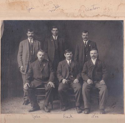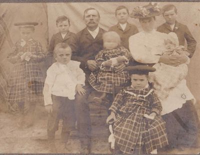 John (1861-1939) is the oldest of his generation. His children with first wife Agnes Schuster (1866-1904) were too old to appear in this school photo. They are: Julia Leisz Campbell (1888-1985), Mary Leisz Califf (1891-1968), Joseph Leisz (1893-1968), John Franklin Leisz Jr. (1895-1977), Anna Leisz (1897-1919), and Theresa "Tess" Leisz Hanlon (1899-1993). These children were grown at the time of this photo.