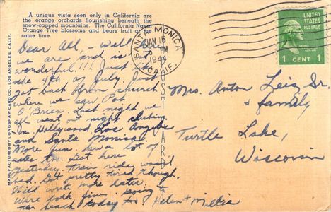 By 1944 Millie was living in Los Angeles, California, a city of dreams. It was the "Golden Age of Hollywood," an era when stars were born and careers in cinematic motion pictures were celebrated. Her sister Helen moved to California with Millie. Both girls took the train from the Turtle Lake Depot across country to Los Angeles, arriving in early January 1944. When their widowed mother Sophia Donaker Leisz took ill with cancer a few years later, both Millie and Helen quit their West coast jobs, and returned to Turtle Lake to live and nurse their mother through her terminal illness. Sophia died on April 7, 1948. After she passed, Millie and Helen returned to live in California.