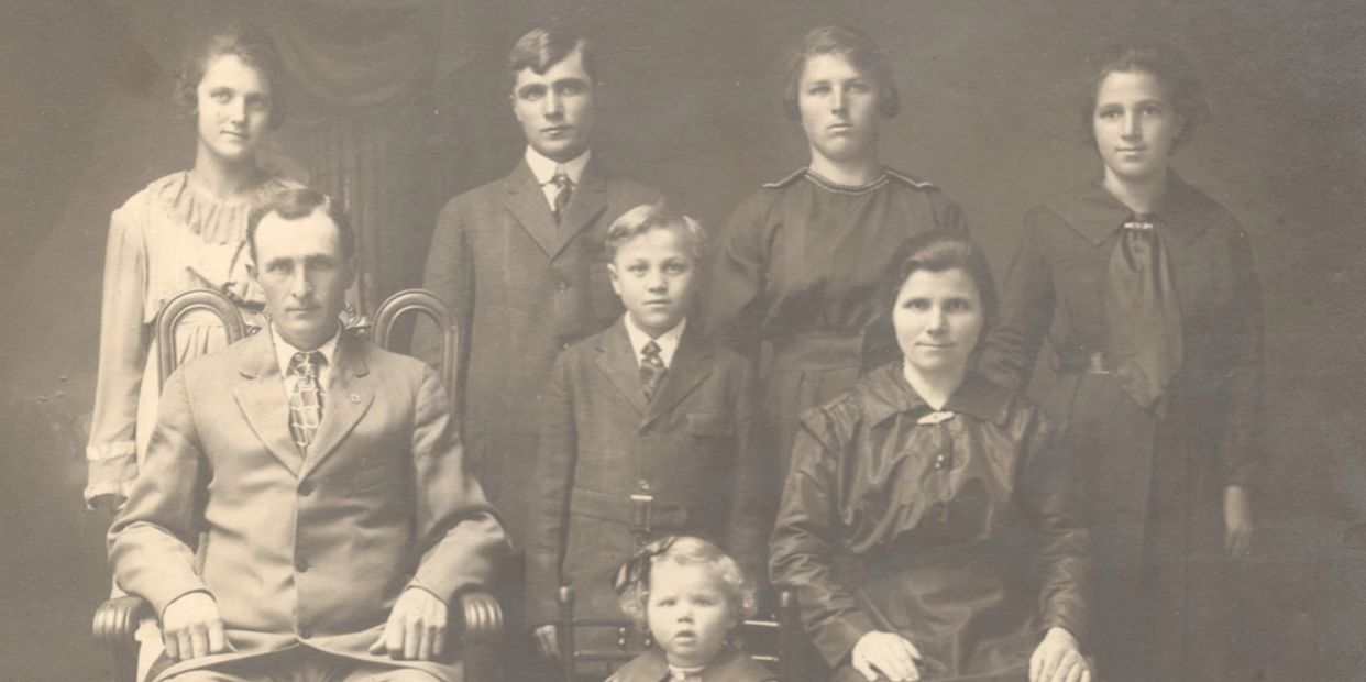 FRONT ROW (from left): Patriarch Anton Donaker (1879-1961), Jacob Donaker (1909-1987), toddler Marie Donaker Garbie (1917-1998), and matriarch Julia Minnichsoffer Donaker (1886-1960).