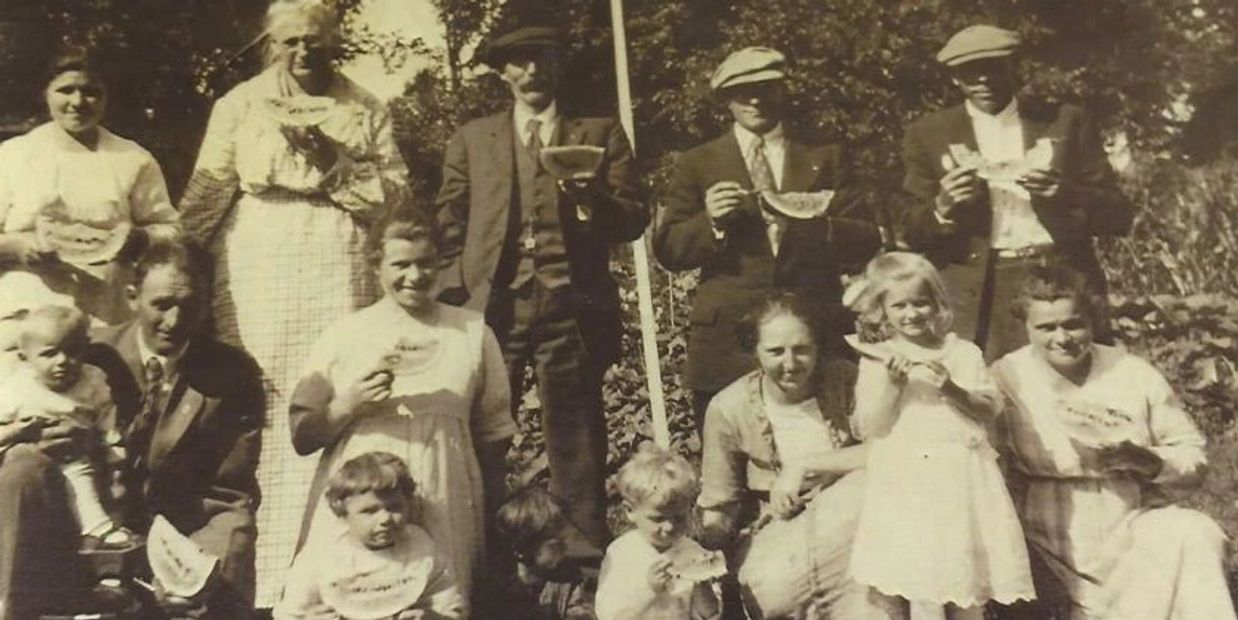Far right, front row is Judy's great-aunt Katie Minnichsoffer Hellstern (1893-1982) and her husband Tony Hellstern (1885-1975) is behind her. Judy notes that they never had any children.