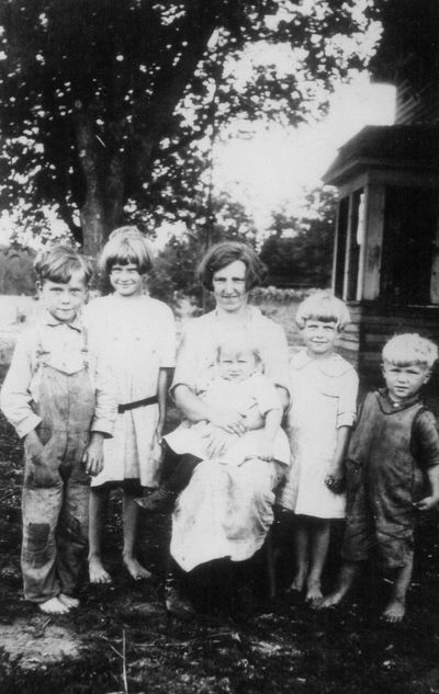 Theodora Greene Minnichsoffer (center) holding youngest child Katherine (1923-2017) and with children (from left) Bernard (1918-1988), Mary (1916-1993), Rosella (1920-2015), and Lawrence (1922-2005), Lindstrom, MN, circa 1925. Dora (1894-1981) is the daughter-in-law of Mary Leisz Minnichsoffer (1862-1903); she married Mary's eldest son Joe Minnichsoffer (1889-1968) on November 16, 1915.