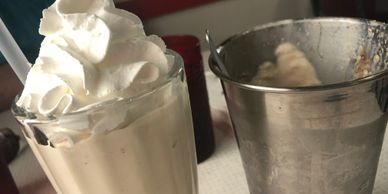 Get a load of this REAL old-fashioned soda fountain treat! At the New Frontier Restaurant in Turtle Lake, Denise and 2nd cousin Al Leisz each enjoyed a malted milk shake with whipped cream, all made with real hard ice cream—just like in the old days! Mmmmm