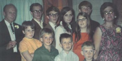 Vernon Leisz (1926-1982) was grandson of Leisz Brother John, and had nine children with wife "Dotz." In this circa 1970s family photo, Vernon's eldest child Dennis is back row, second from left; and John "Huntz" is back row, second from right.
