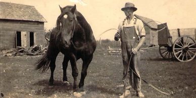Leisz Brother John (1861-1939) had eight children with wife Agnes Shoemaker (Schuster). Youngest son was John Franklin Leisz (1895-1977), shown here. John Franklin and wife Stella are parents of Vernon Leisz (1926-1982) and grandparents to Vernon's nine children (above photo right). Here John Franklin is shown on the family farm in Turtle Lake, circa 1925.