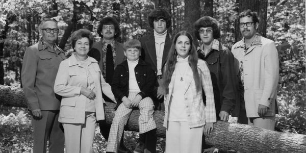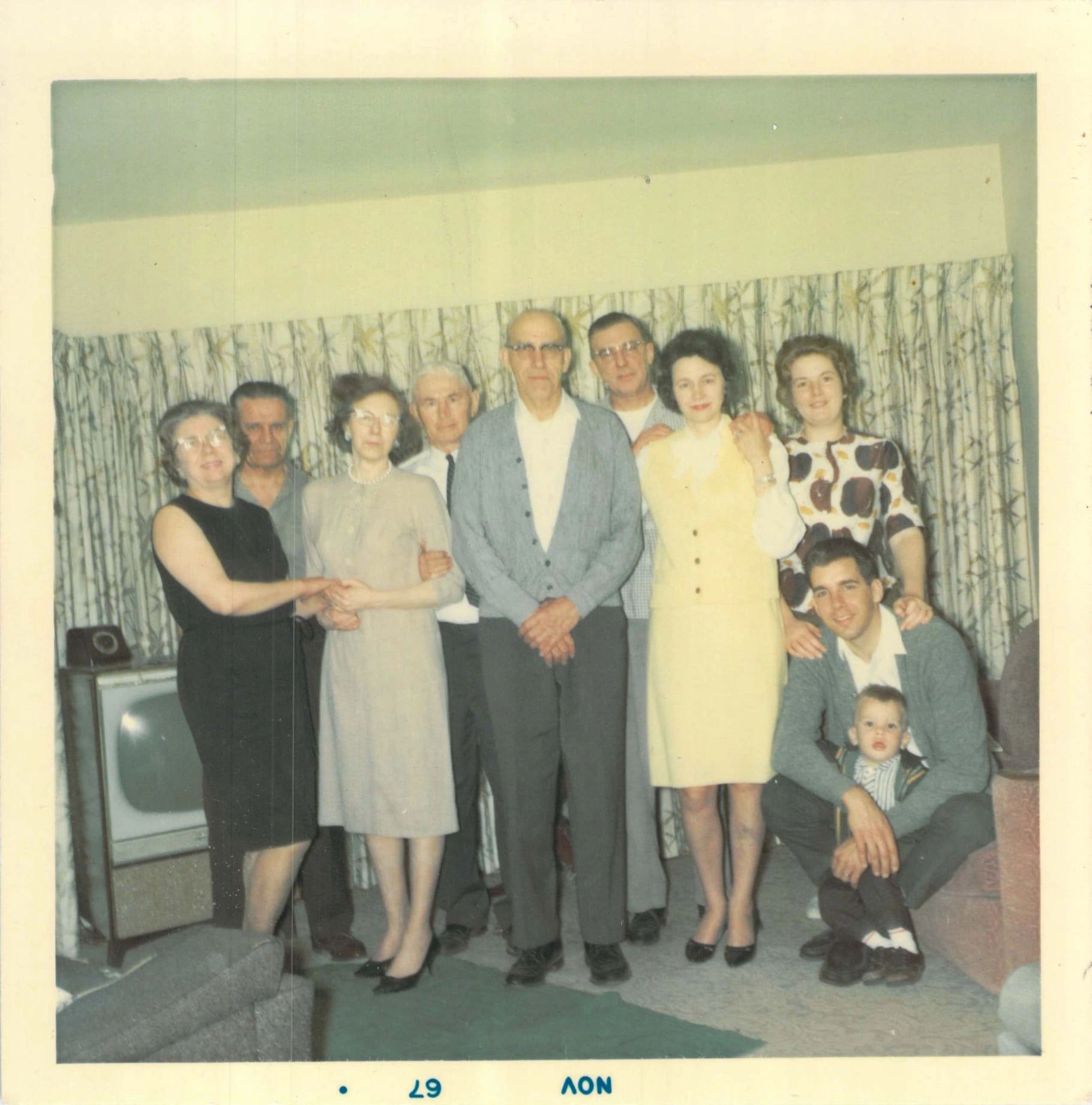 Our cousin Chuck Davis passed away peacefully on Nov. 3 surrounded by his 7 children and wife Sandy (obit). Chuck and Sandy are shown here at right with their son Chucky in 1967, and Chuck's father (center) plus his mother's sisters and their husbands—Lucy, Marie, Josephine—who are children of Leisz Brother Joseph.